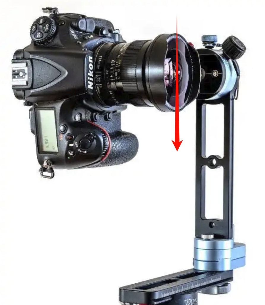 在我们进行宁波VR全景拍摄的过程中,除了部分要求不高的使用VR全景相机外,宁波专业的都是用专业相机,我们在使用专业相机的时候,必不可少的就是VR云台,在长时期用过VR云台的人我想都会遇到一个相当无语的问题:拍摄过程中会出现相像镜头向正下文下垂,如下图箭头方向下垂。